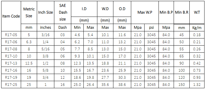 Hydraulic Rubber Hose SAE 100 R17, High-pressure hydraulic oil lines. Exceeds SAE 100 R17 requirements and Performance requirements of EN 857 1SC. The hose has smaller exterior dimensions and significantly tighter bend radius than other SAE 100 R1 and SAE 100 R2 hose.